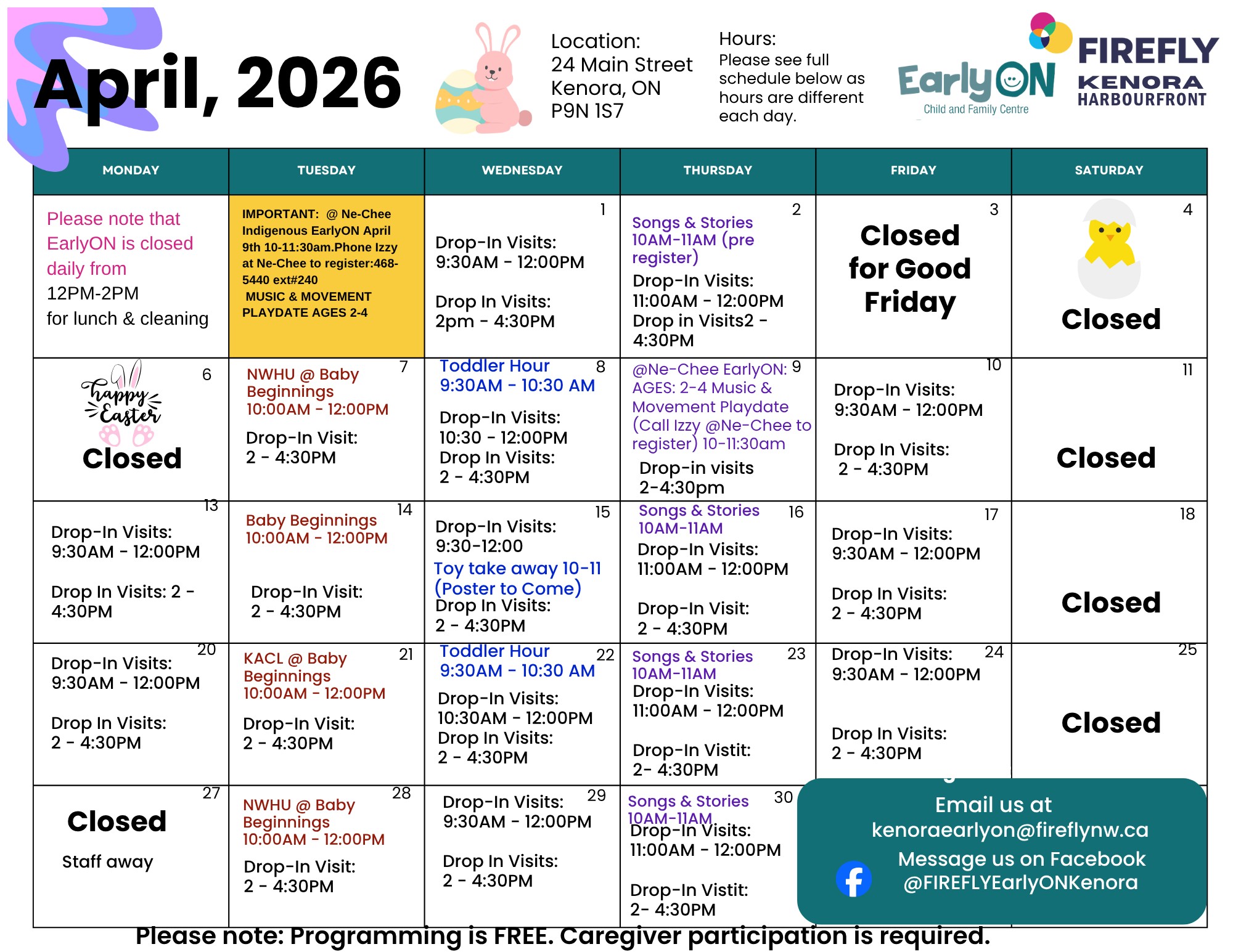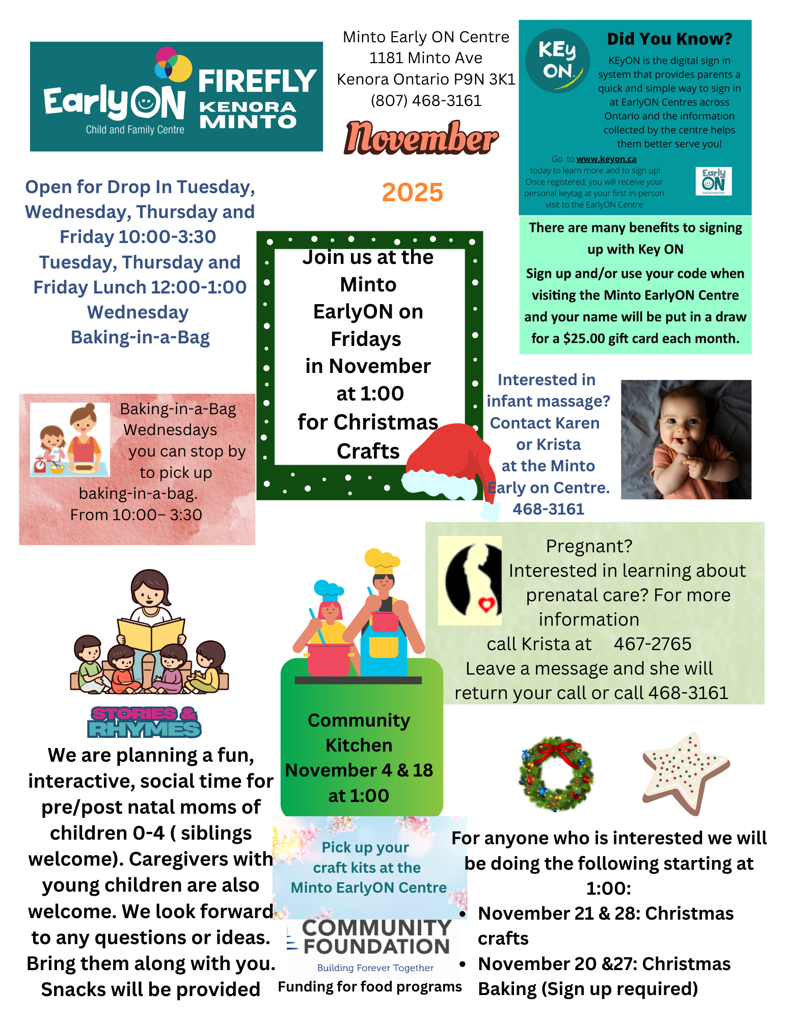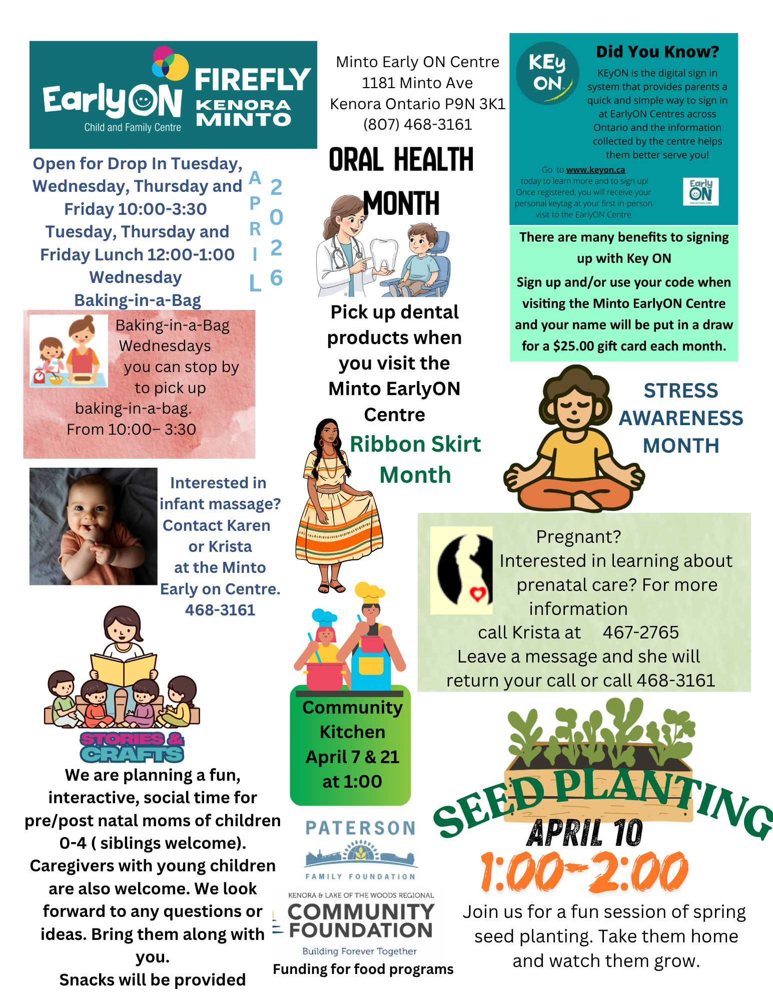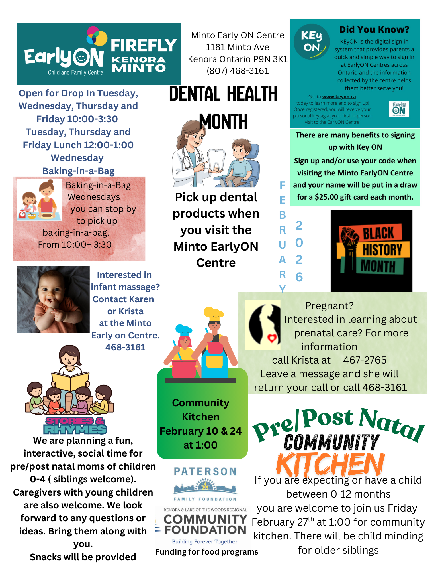 Provides information and support on child development and parenting to families with children up to the age of 6 years in Kenora and Sioux Lookout. Play-based learning opportunities are provided for children and their families to participate in together. Parents/caregivers also connect with other families through casual conversations and activities and learn about other services available in the community.