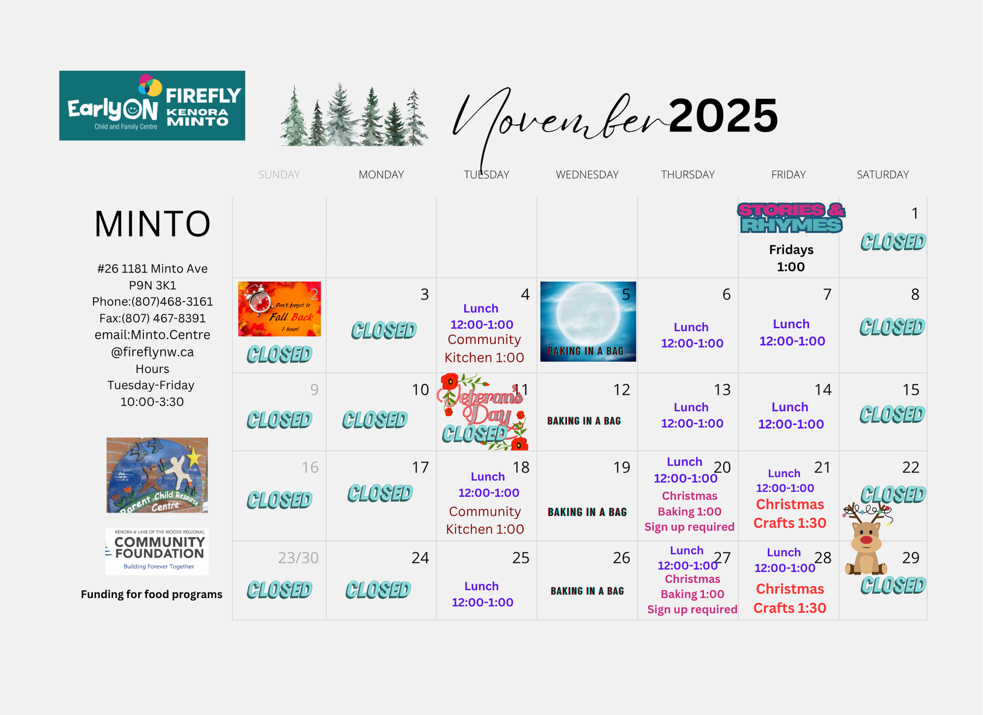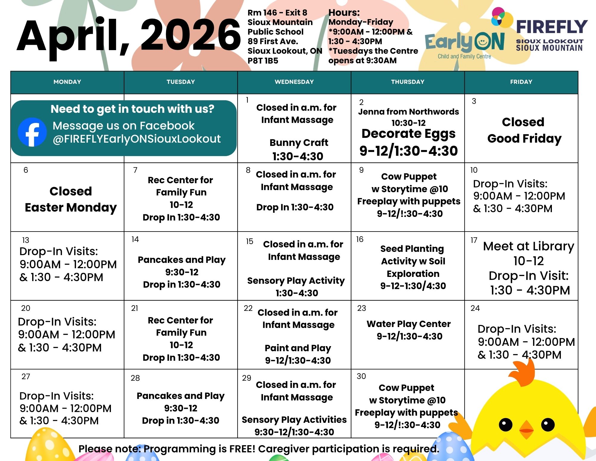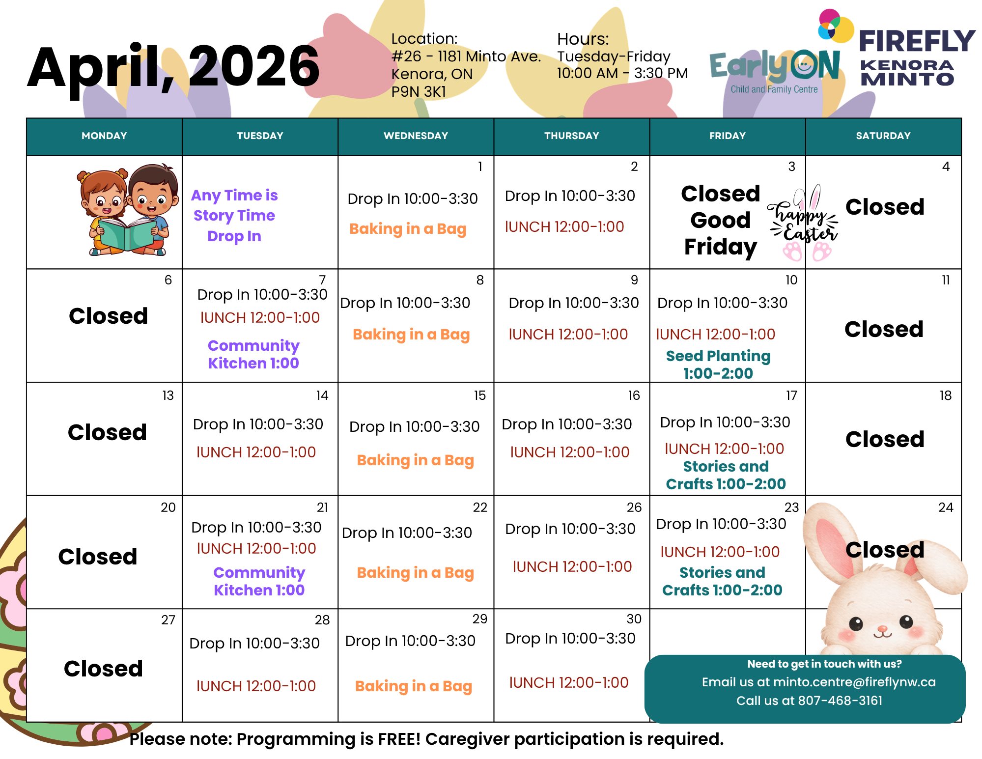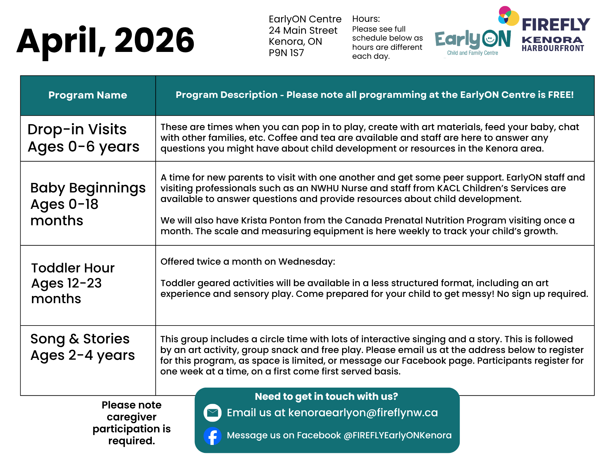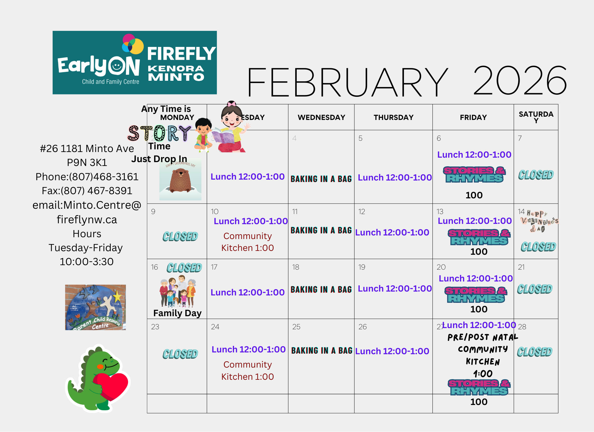 Each month our EarlyON Child and Family Centres share a newsletter as a look ahead to the month’s events and activities taking place at the centres. To see each community’s newsletter click below: